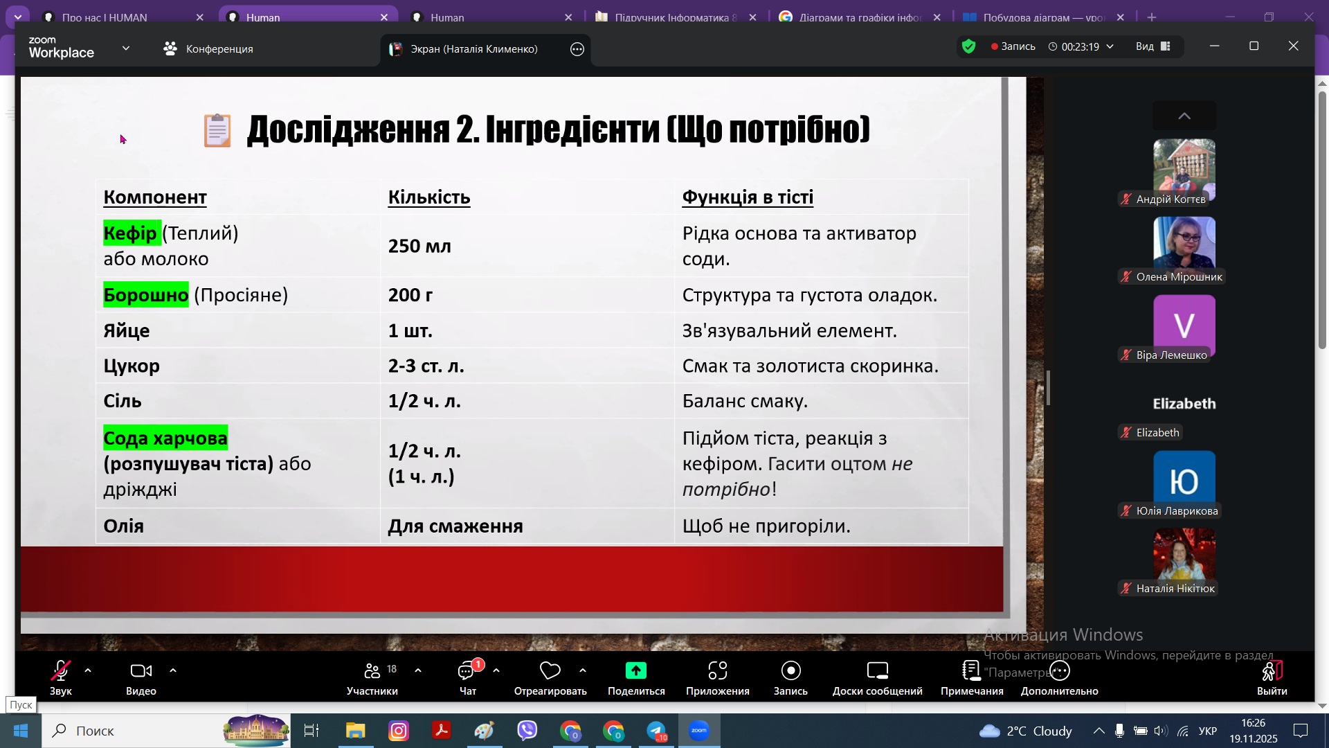 19 листопада 2025 року вчителькою хімії та біології КЗ “Харківська спеціальна школа 5” було проведено майстер-клас з хімії «Хімічимо вдома». Хімія вивчає речовини, які лежать в основі життєвих процесів. Прояви життя проявляються через складні хімічні реакції, такі як дихання, фотосинтез і засвоєння їжі, що є ключовими для існування організмів. Хімія як основа життя дає дітям розуміння, що всі живі організми складаються з хімічних сполук, включаючи білки, жири, вуглеводи та нуклеїнові кислоти. А саме життя залежить від безлічі хімічних реакцій, які забезпечують обмін речовин, виділення енергії та синтез необхідних молекул. Вважається, що перші живі організми з’явилися внаслідок простих хімічних реакцій в середовищі, що складалося з води, аміаку, метану та діоксиду вуглецю. Захід було спрямовано на практичний бік хімічних процесів в життєдіяльності кожної людини. Кожний день ми вживаємо їжу. А процес засвоєння їжі (травлення) — це складний процес хімічного розщеплення їжі на простіші речовини для отримання енергії. Саме їжа є енергетичним ланцюжком, що забезпечує життєдіяльність на необхідному рівні.