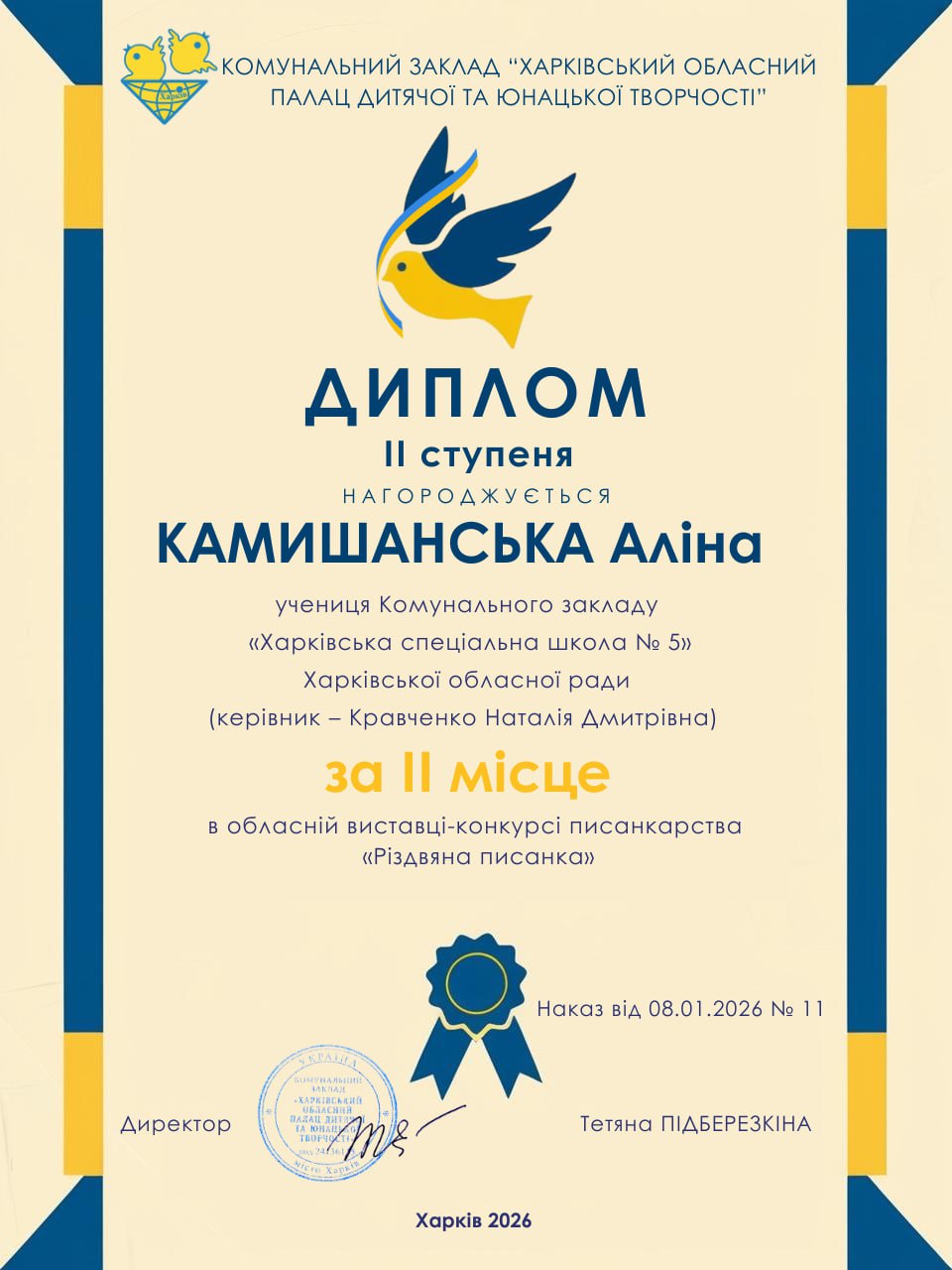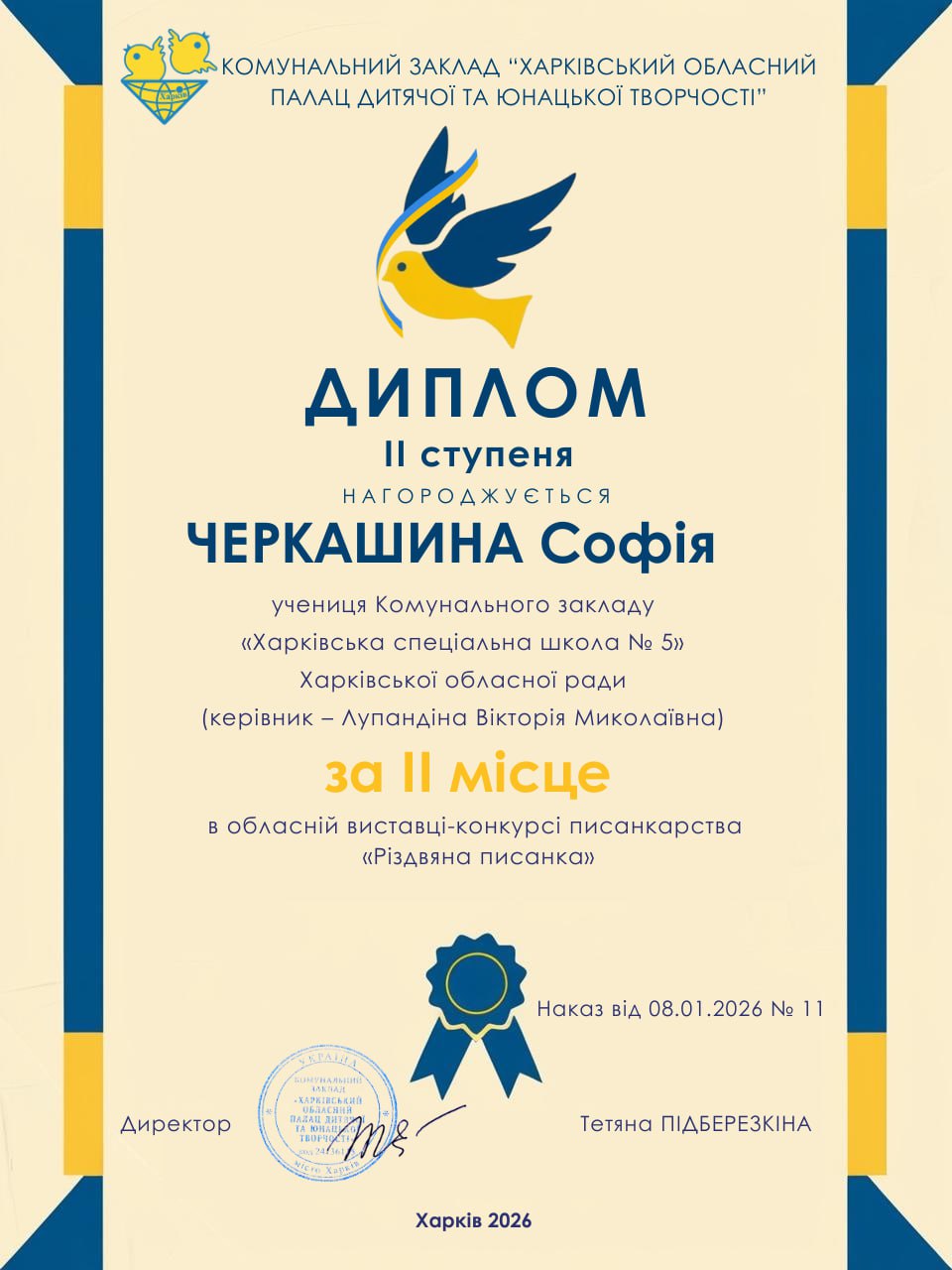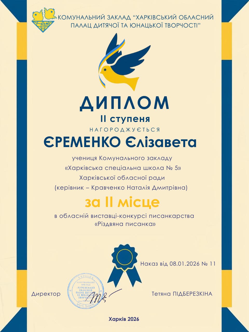 20 грудня 2026 року учні КЗ “Харківська спеціальна школа 5″ ХОР отримали дипломи різних ступенів за участь в обласній виставці-конкурсі писанкарства «Різдвяна писанка». З метою формування національної та громадянської ідентичностей серед дітей і підлітків, популяризації писанкарства, підтримки обдарованої учнівської молоді та розвитку мережі гуртків писанкарства на Харківщині з 25 грудня 2024 року до 10 січня 2025 року в Харківському обласному Палаці дитячої та юнацької творчості” відбулась обласна виставка-конкурс писанкарства «Різдвяна писанка» в дистанційній формі.