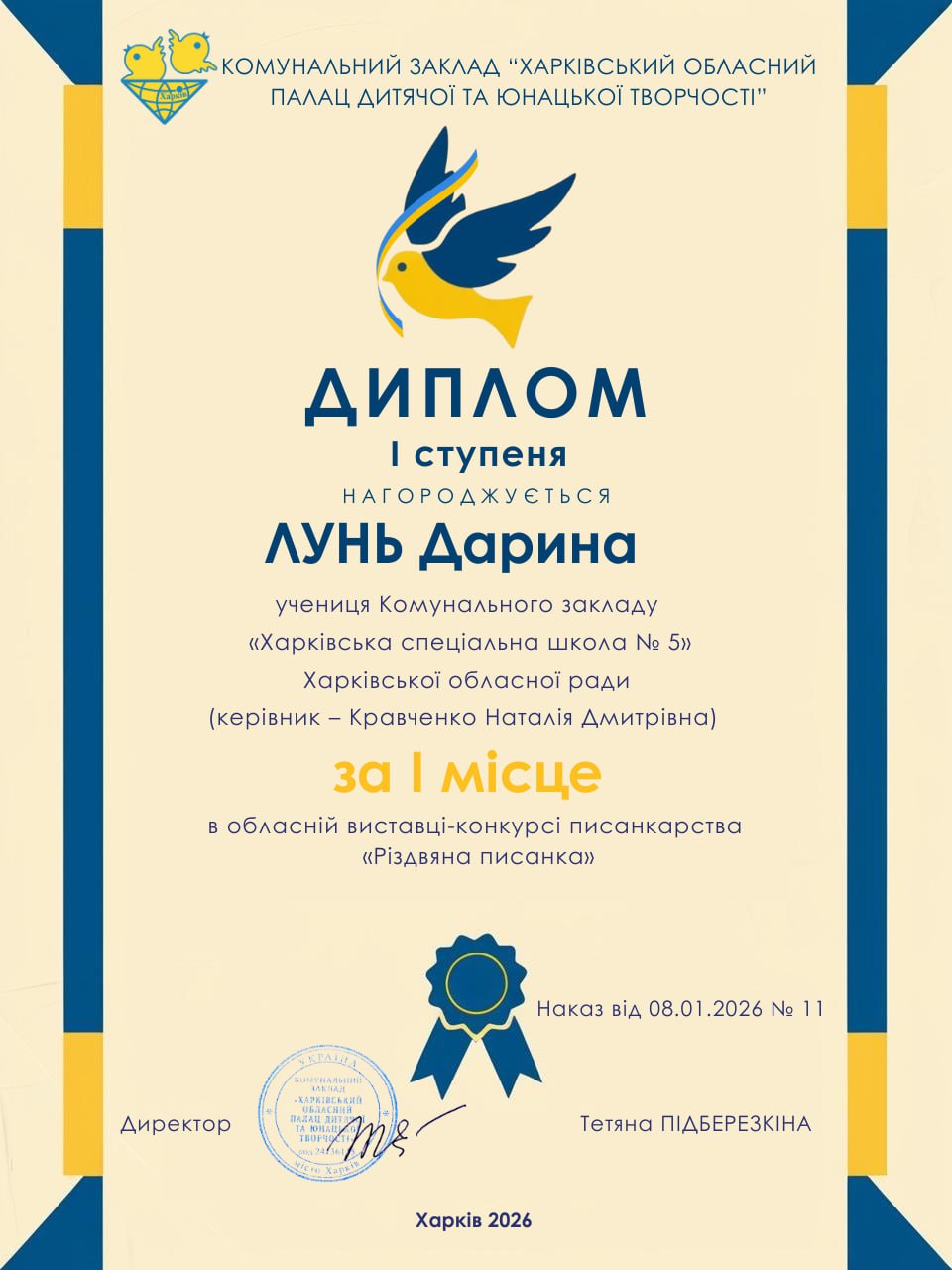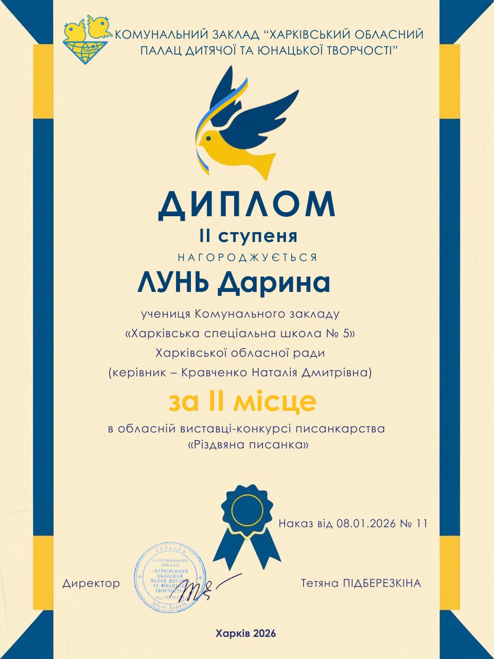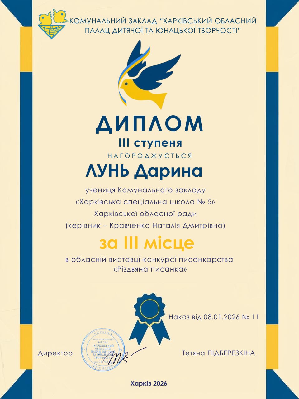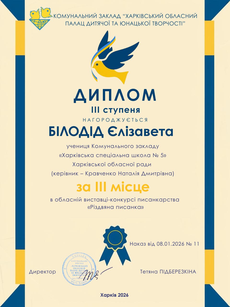 20 грудня 2026 року учні КЗ “Харківська спеціальна школа 5″ ХОР отримали дипломи різних ступенів за участь в обласній виставці-конкурсі писанкарства «Різдвяна писанка». З метою формування національної та громадянської ідентичностей серед дітей і підлітків, популяризації писанкарства, підтримки обдарованої учнівської молоді та розвитку мережі гуртків писанкарства на Харківщині з 25 грудня 2024 року до 10 січня 2025 року в Харківському обласному Палаці дитячої та юнацької творчості” відбулась обласна виставка-конкурс писанкарства «Різдвяна писанка» в дистанційній формі.