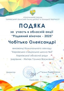 Подяка за участь в обласній акції “Різдвяний віночок” від Харківського обласного Палацу дитячої та юнацької творчості