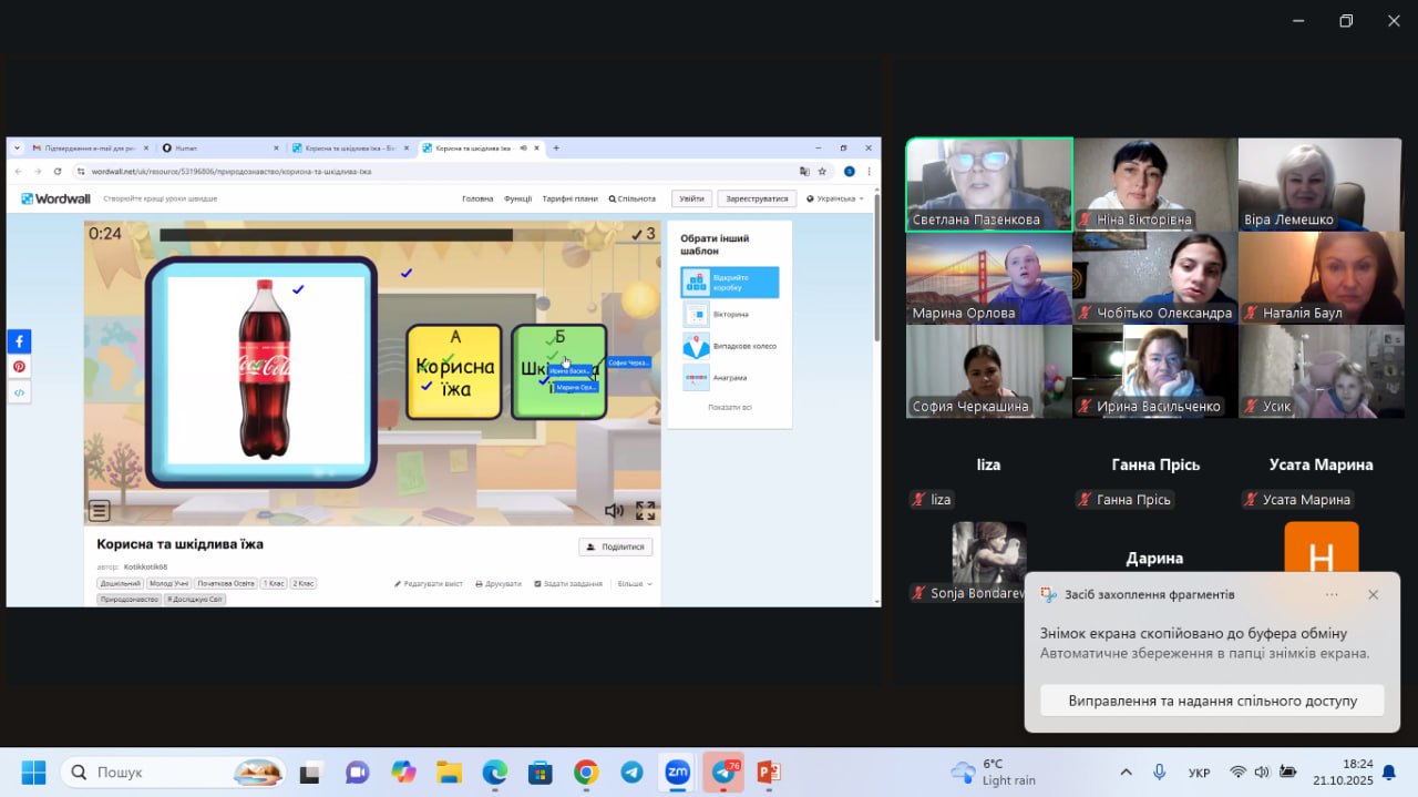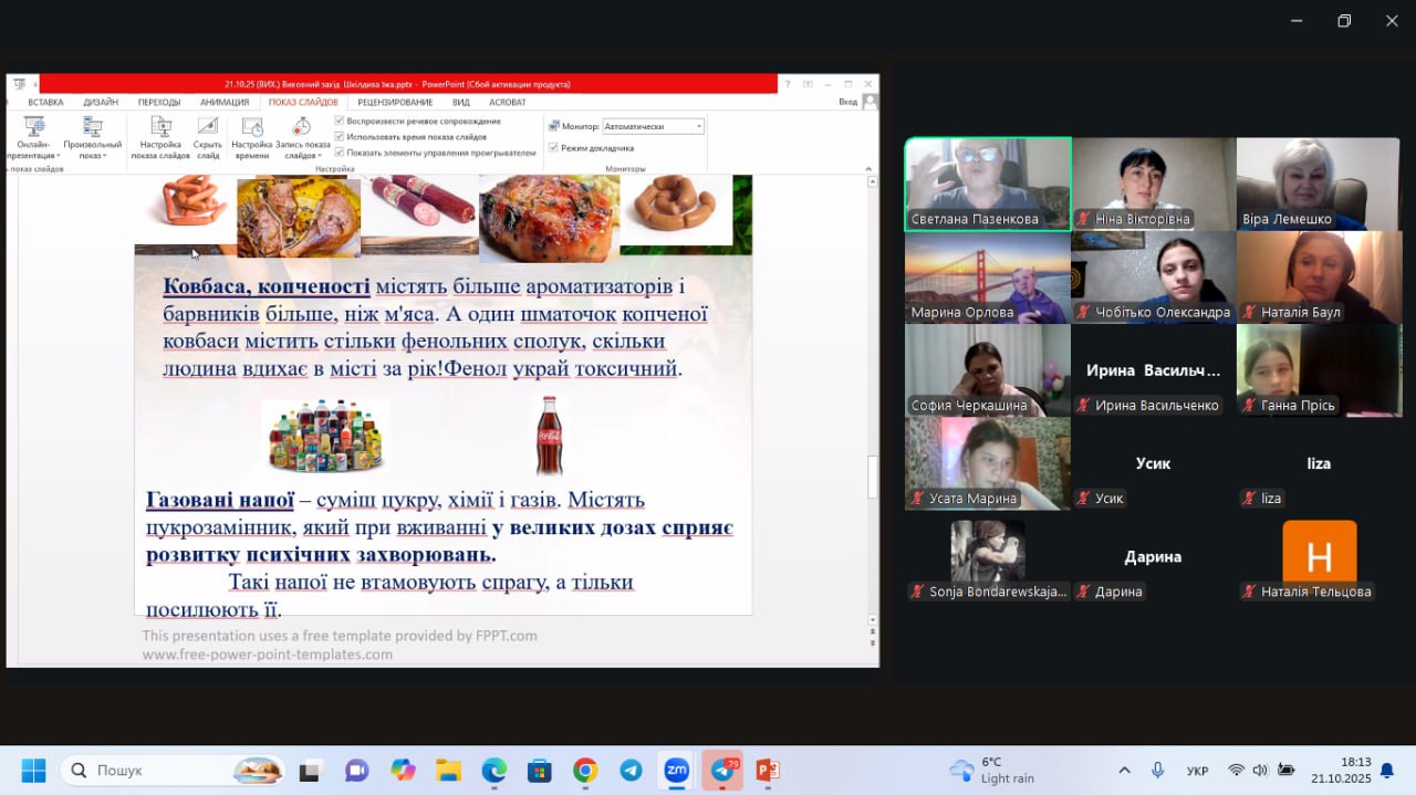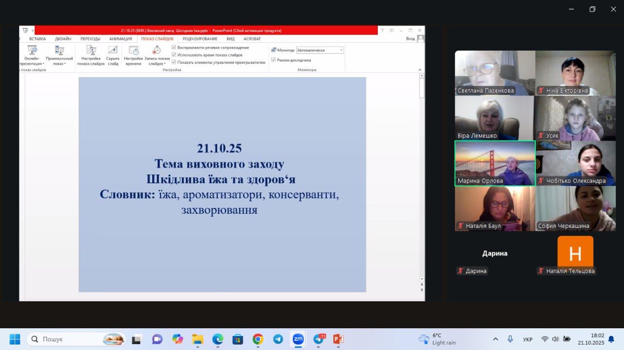 Також учні ознайомились з презентацією в якій було зазначено що до шкідливої їжі належать: фастфуд (бургери, картопля фрі, хот-доги, піца);газовані напої та енергетики — містять багато цукру й кофеїну; чіпси, сухарики, ковбаси — мають надлишок солі й консервантів; солодощі у великих кількостях — можуть спричиняти карієс, надлишкову вагу та втому.